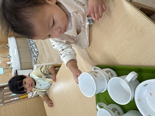2025/12/03 よいしょ 最近あひる組さんでは使った食器やコップをかごやお盆の中に入れることをしています!きっかけは食べ終わった子どもがお皿を重ねていたことから始まりました☆今では食べ終わると自然にトレーの中に食器を戻すようになりました!どこに重ねたらいいのかコップはどこに置くのかを考えながら片付けています☆