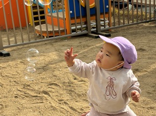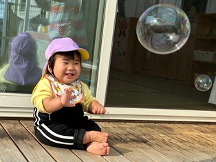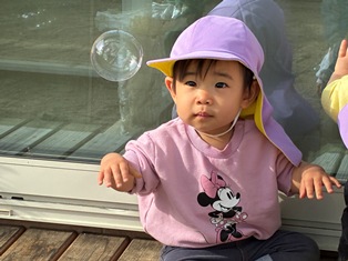 2025/12/03 シャボン玉 戸外に出てシャボン玉を飛ばしてもらったよ!風もよく吹いていてどんどん高く飛んでいったね♪手が届きそうで…目の前でパチンっと割れて不思議だね!!