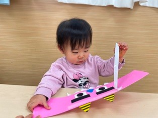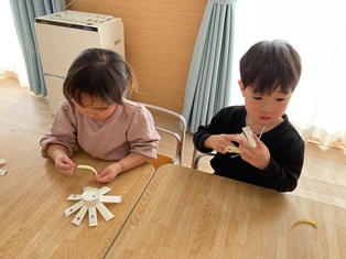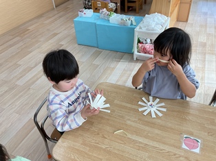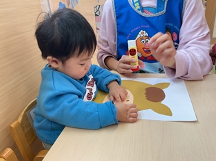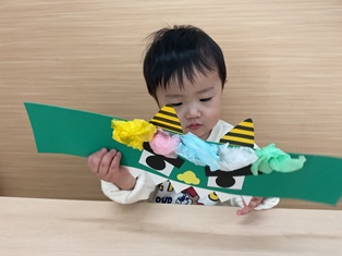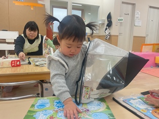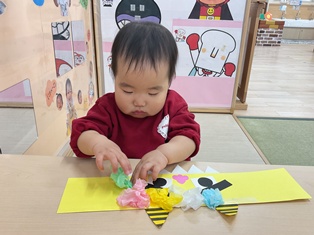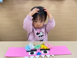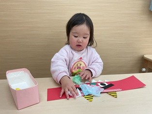 2026/01/20 鬼のお面製作 そろそろ節分!豆まきに向けて「♪まめまき」の歌を歌ったり鬼の絵本を見たり…準備ばっちりなひよこ組さん✨鬼に見つからないようにみんなも鬼のお面を作って変身だ☆両面テープをびびびーっとはがして丸めた花紙をぺたぺた!あっという間に完成しましたよ!出来る製作も増えてきて楽しいね!!(^▽^)/