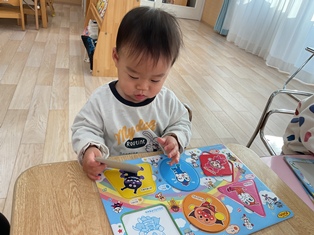 2026/01/17 手指あそび パズルにも挑戦してみたひよこ組さん!できる手指あそびも増えてきたね🌟初めて挑戦しましたが、よくよく色や形キャラクターを見て上手にはめ込むことが出来ました✨お片づけもがんばってくれていますよ♪新しいお友だちは園での初めての製作!!!!先生と一緒に福笑いをしてみたよ💕