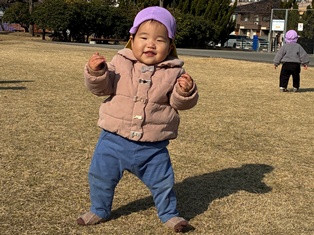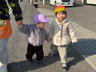 2026/01/19 一緒にお散歩♪ 今日はりす組さんと一緒にお散歩に行きましたよ♪仲良く手を繋いでもらうととっても嬉しそうでずぅーっとお姉ちゃんのほうを向いちゃうひよこ組のお友達(笑)公園に着くと芝生の上をあんよ♪あんよ♪とってもぽかぽかでした☀