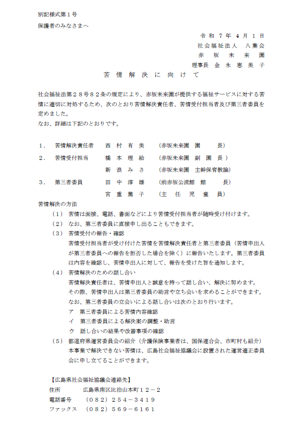 ご要望や苦情等がある場合は、赤坂未来園の苦情受付担当者が随時受け付けます。